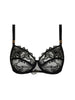 Upper cup in embroidered tulle with scalloped edging, enhanced with organza inlays. The lower cup is crafted in matching embroidered fabric. The lined tulle basque offers optimal comfort. The semi-sheer tulle center gore is adorned at the base with an embroidered motif accented with gold cabochons, creating a captivating cut-out effect against the skin. A gold-tone jewel detail enhances the strap base.