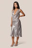 Made from Italian silk lamé, the Le Disco Cowl Midi Dress shimmers with every movement. A draped cowl front and low back are complemented by tie strings at the shoulders, while a flounce hem adds a playful, flowing finish. Shimmer under the lights and own the night in true disco-glam style.
